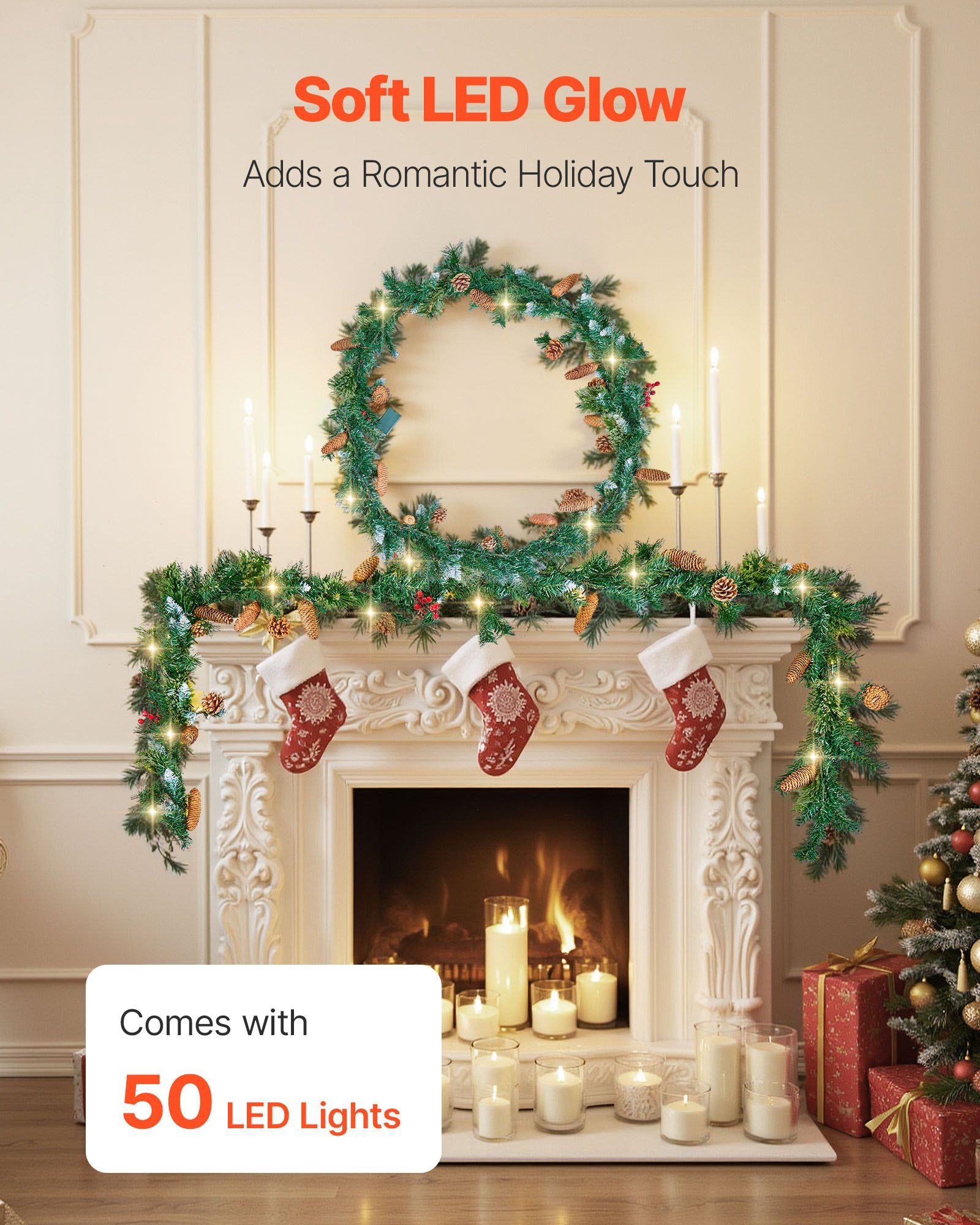 2.Includes LED Lights: Equipped with 50 warm white LED lights, this greenery garland gives off a cozy glow at night, adding a magical touch to your decor and enhancing the holiday atmosphere. Requires 3 AA batteries (not included)